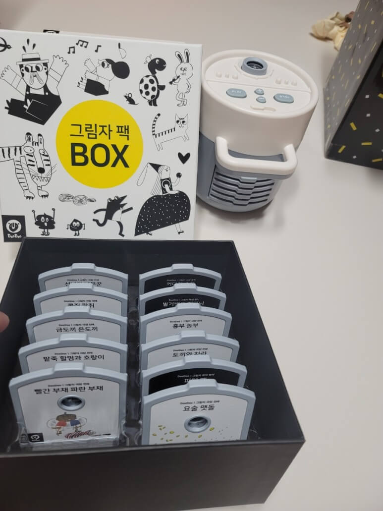박스를 뜯으면 제품 본체와 팩들(팩들로 원하는 스토리로 교환합니다.) 책들은 아직까지 어려서 안 보여주고 좀 더크면 보여주면 됩니다. 팩들 일부는 통에 보관하고 일부는 본체에 꼽아서 보관하다가 원하는 팩을 골라서 꼽으면 재생을 시작합니다.