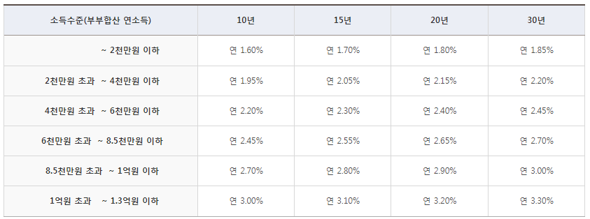부부의 소득 수준에 따라 금리가 달라집니다. 아래 표 참조하세요. 주택도시기금 캡처 입니다.