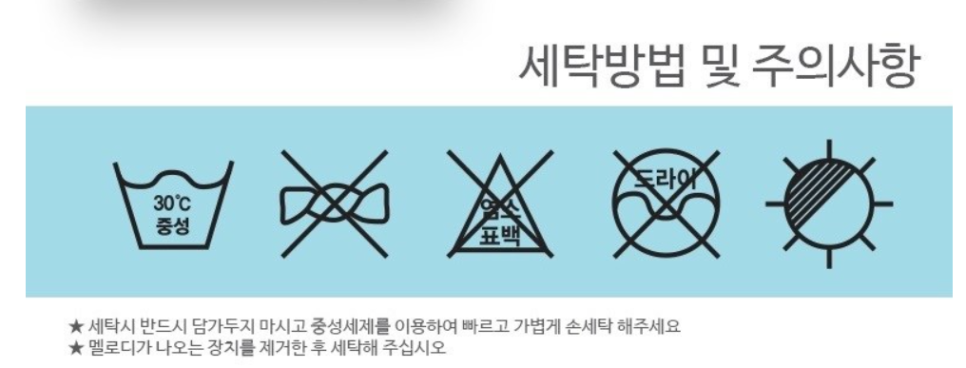세탁 시 담가 두지 말고 중성세제를 이용해서 손세탁 요청합니다. 실제로 저는 아기 세탁기로 빨고 건조기 섬세 모드로 건조했습니다. 크게 문제는 없었습니다. 하지만 다른 리뷰 보니 실밥 터진다는 말도 꽤 있었습니다. 주의사항과 같이 손빨래 후 햇빛에 말리는 것이 가장 좋을 것 같습니다.