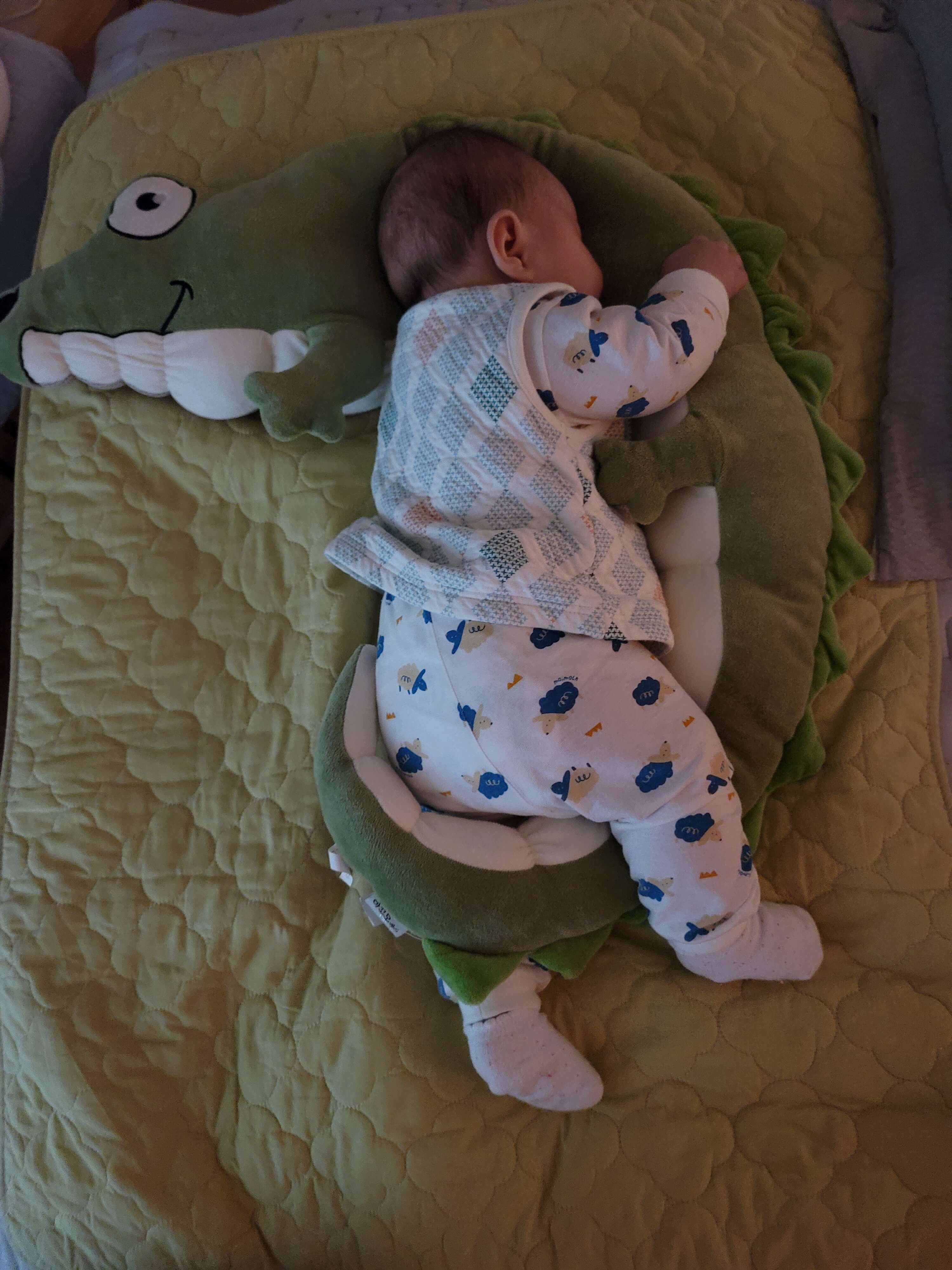 낮잠 재울때 바로 재우면 잘 안 자고 놀려고 하는데 옆으로 재우면 의외로 아기들이 잘 잡니다. 사용법은 아기가 졸려할 때 사진처럼 움푹 들어간 부분이 머리 부분입니다. 여기 머리를 눕히고 한쪽 팔은 악어 아래로 한쪽 팔은 악어 위로 올려줍니다. 그리고 다리도 한쪽은 아래로 한쪽은 위로 자세를 잡아주면 엄청 편한지 잘 잡니다. 물론 잘 때 쪽쪽이는 하나 물려줍니다.