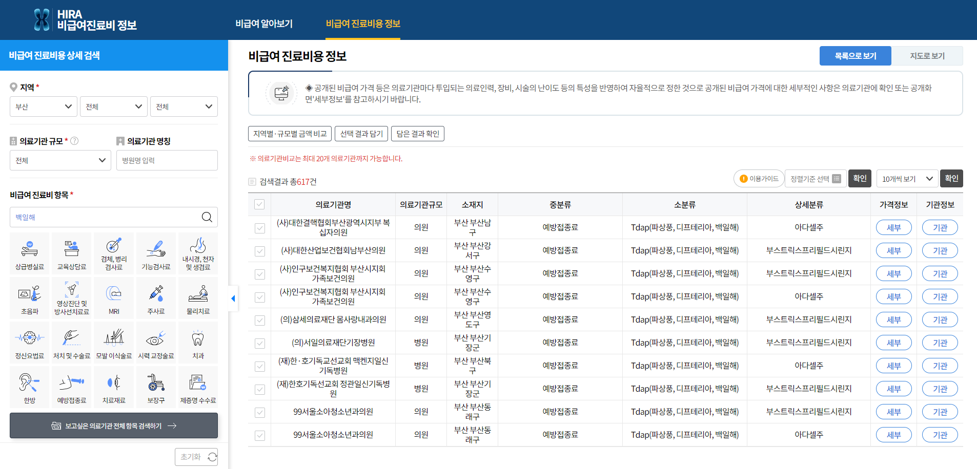 사이트 접속하여 지역을 선택하고, 비급여 진료비 항목에 백일해 를 검색하면 쭈욱 나옵니다.